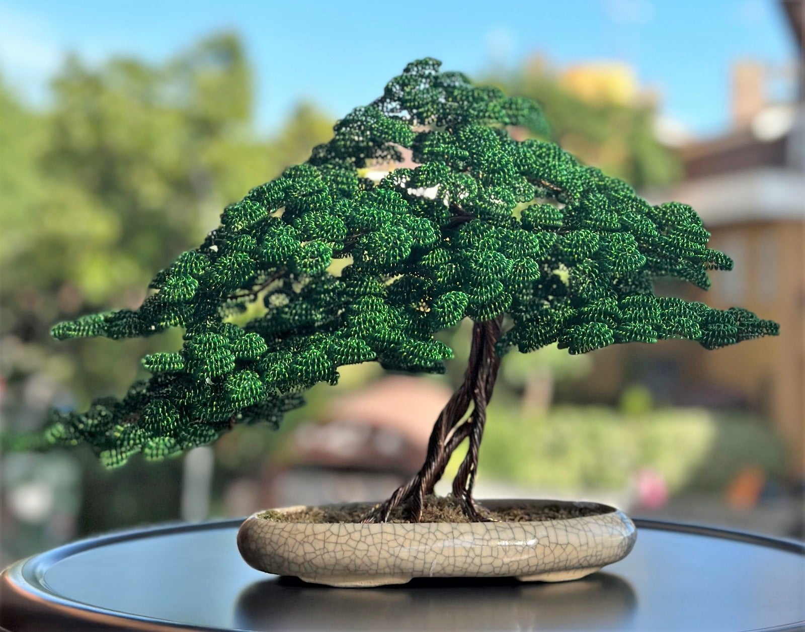 Il tronco marrone, modellato con filo di metallo, aggiunge un tocco di calore e un elegante contrasto che valorizza l’intera composizione, trasformando il bonsai in una vera opera d’arte.