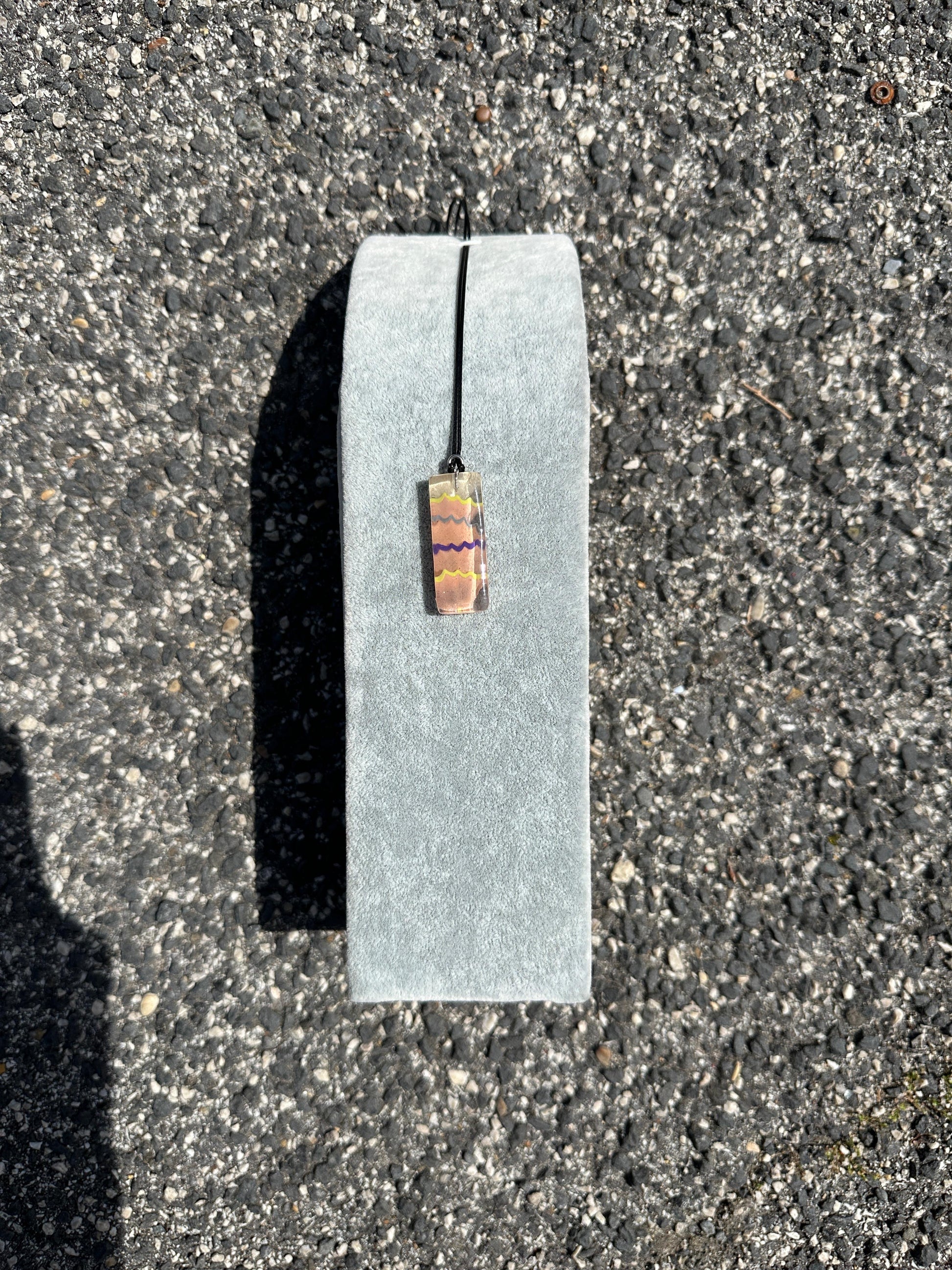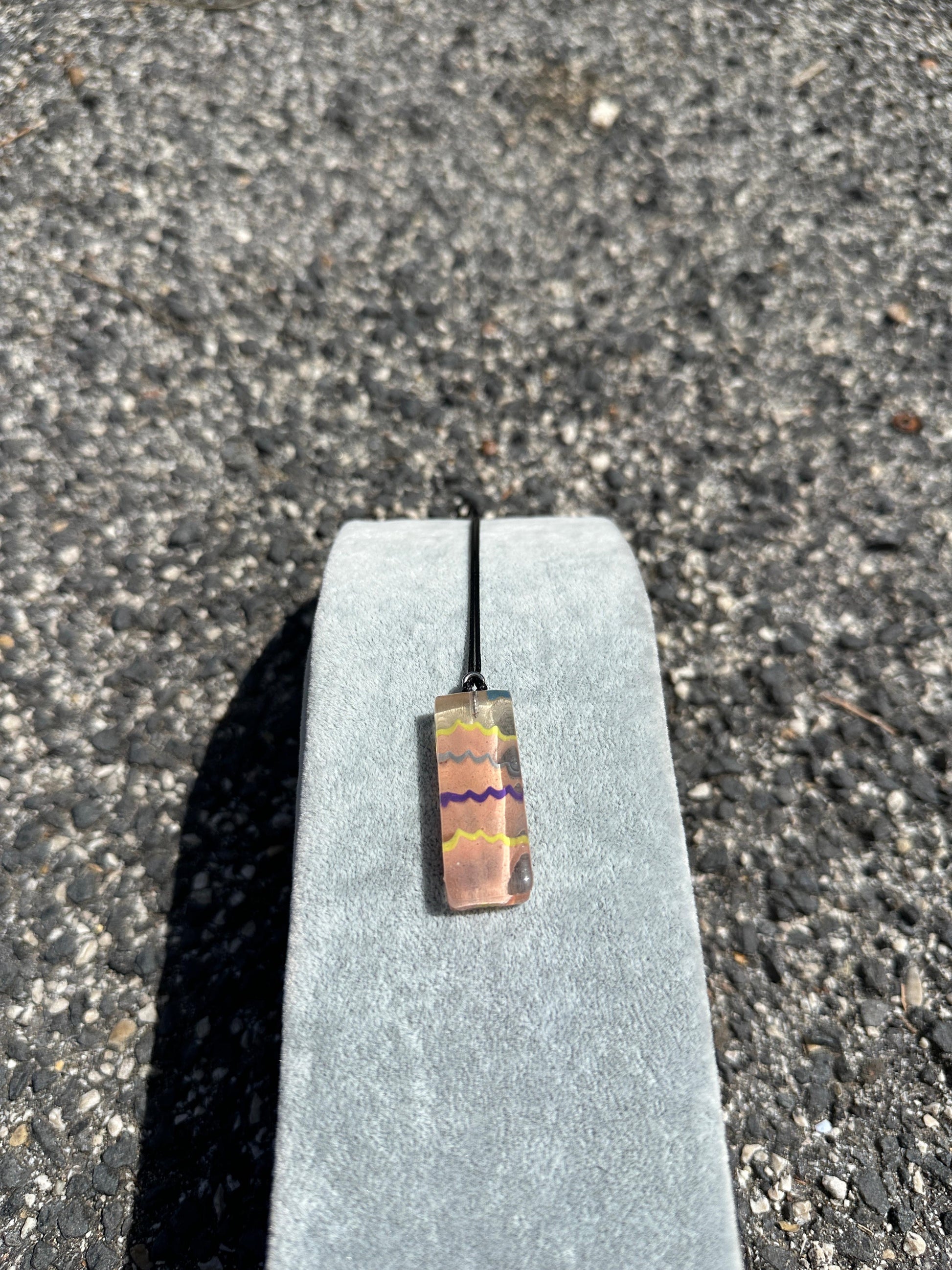 Pendente artigianale fatto a mano in resina con disegni geometrici colorati, montato su cordino nero con chiusura in acciaio inossidabile. Ogni pezzo è unico grazie alla colata manuale dei colori. Leggero, moderno e vivace